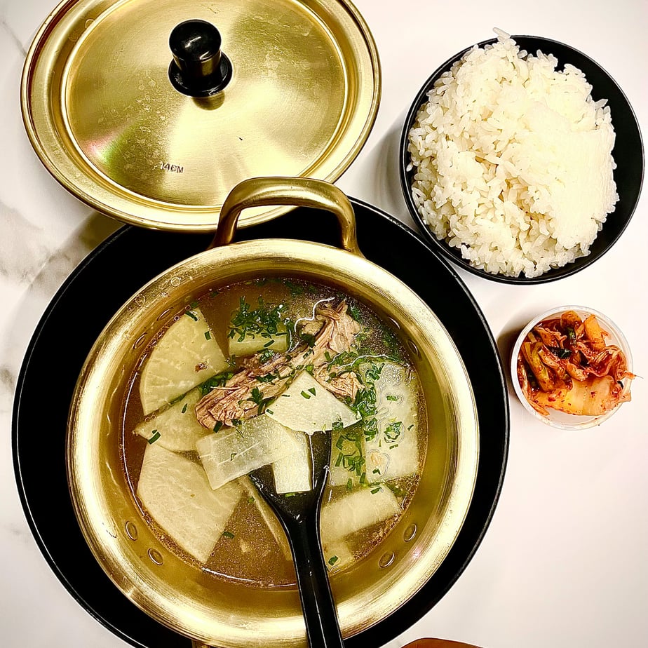 Rich and savory. Made from scratch with bone broth with beef and radishes. Served with steamed white rice and a side of kimchi.