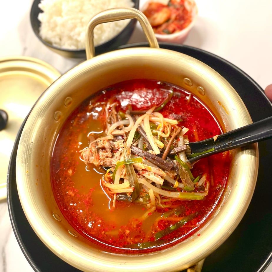 Traditional spicy beef soup with soybean sprouts, green onions, bracken and shredded beef. Served with steamed rice and a side of kimchi.