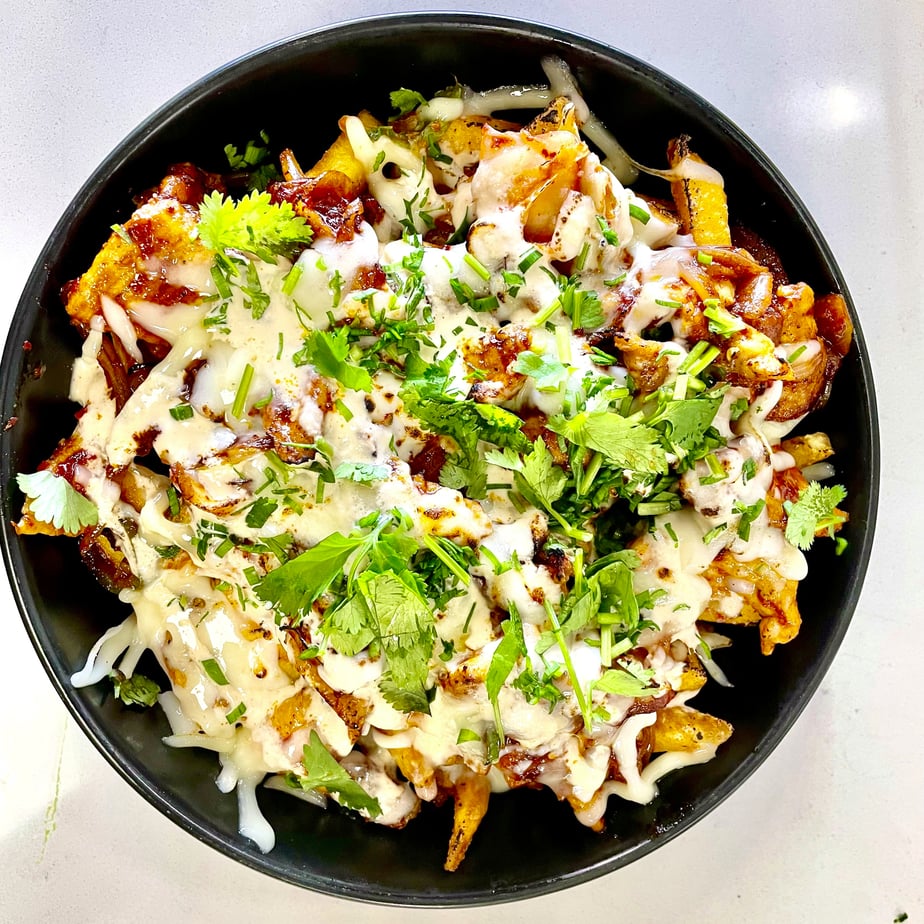 Extra crispy french fries topped with homemade stir-fried kimchi, BBQ Jeyuk, melted cheese, and sprinkled with chives and cilantro