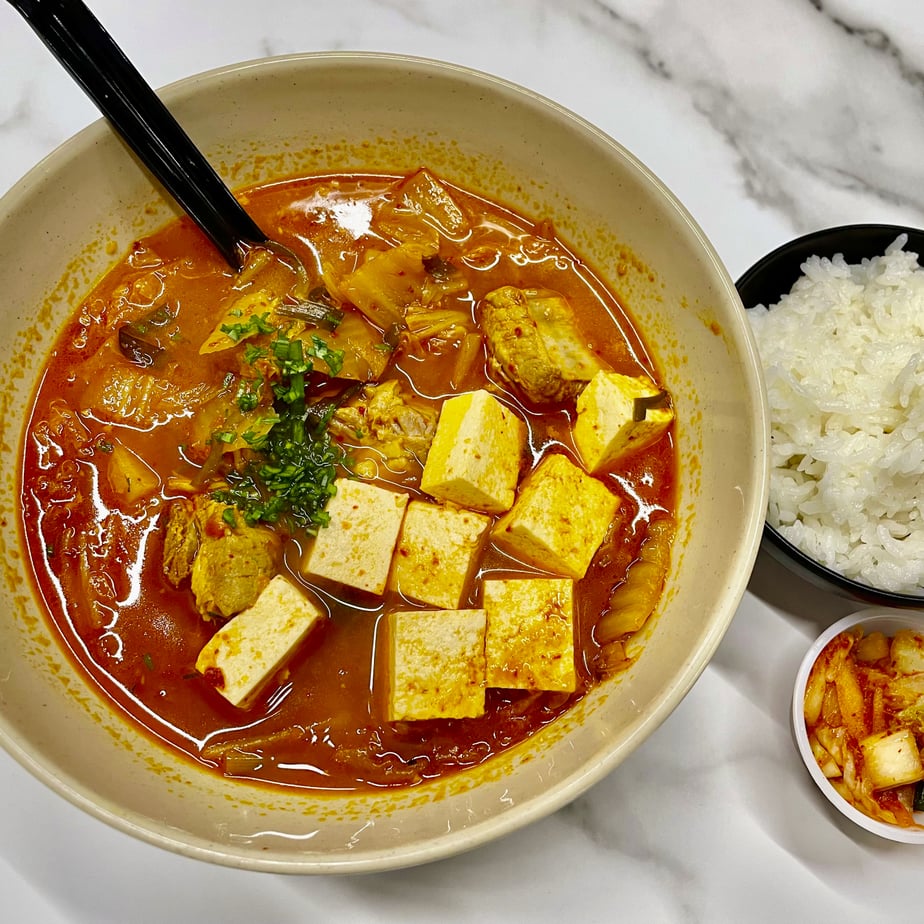 A combination of sour, savory, and salty. Cooked kimchi with pork and tofu. Served with steamed rice and a side of kimchi, when selected.